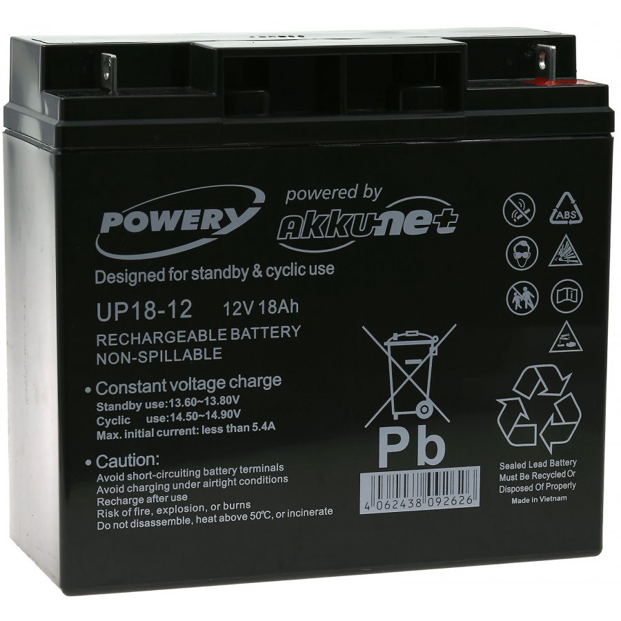 12V18Ah/216WhLead-Acidpreto181mm x 76mm x 167mmPowery4051363599140Este lote Inclui 2 baterias de chumbo-seladas. As baterias também estão disponíveis em unidades individuais