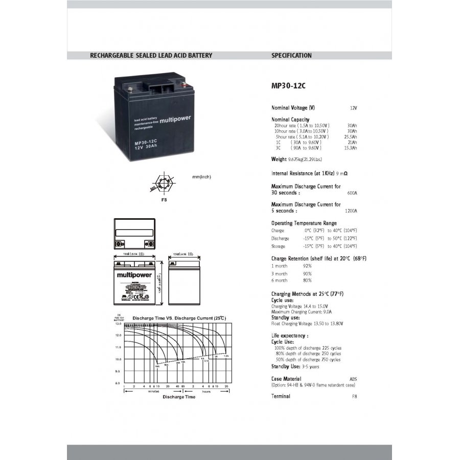 12V30Ah/360WhLead-Acidpreto166mm x 126mm x 176mmMultipower4062438101427Bateria de marca de alta qualidade sem manutenção. Especialmente concebidos para aplicações cíclicas tais como cadeiras de rodas, carrinhos ou caddies.